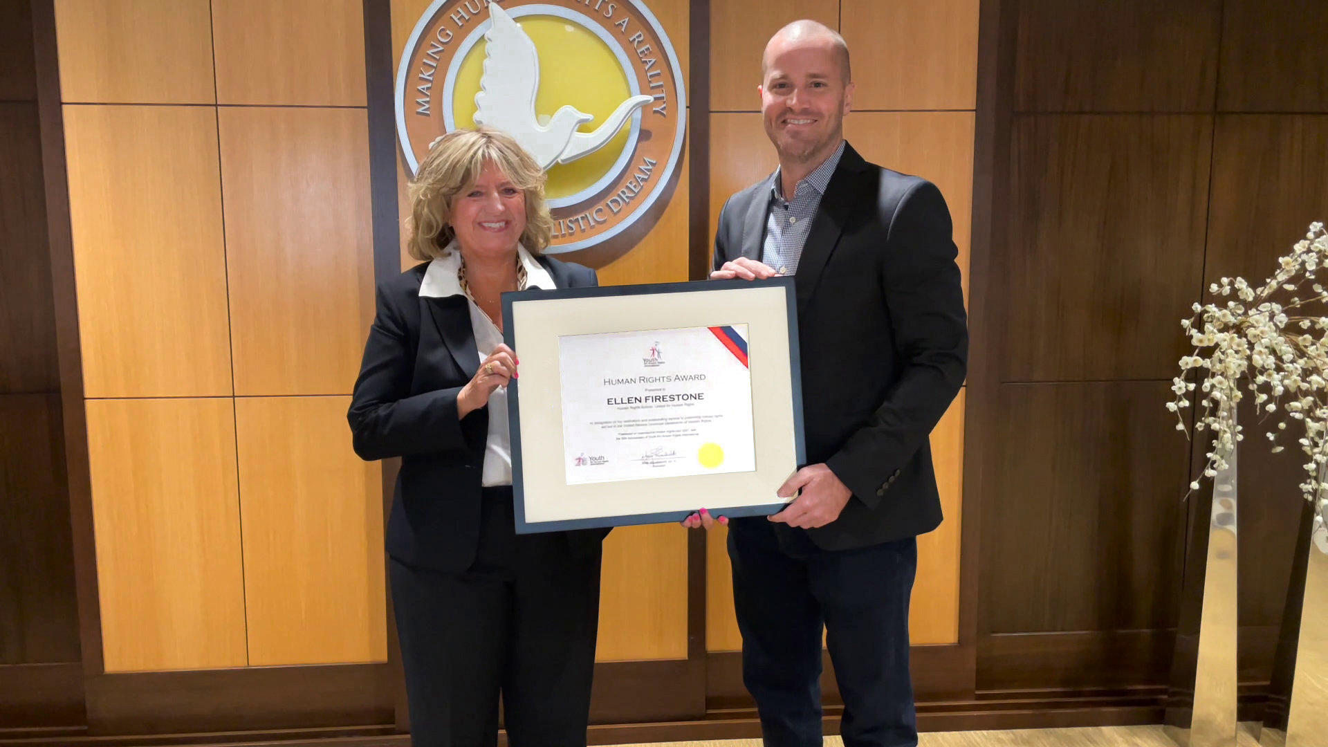 Den första pristagaren var människorättsambassadören Ellen Firestone, som har arbetat med Internationella Ungdomar för mänskliga rättigheter sedan 2007. Under det gångna årtiondet har hon hållit workshoppar och föredrag om ”Mänskliga rättigheter: från utbildning till handling”, lanserat sin egen podd om mänskliga rättigheter och tjänat i flera icke-statliga organisationer för mänskliga rättigheter, såsom Global Education Motivators i Philadelphia. Hon har nått mer än 80 000 med sitt budskap om mänskliga rättigheter. ”Med kunskap följer ansvar”, säger Firestone. ”Vi har det viktiga jobbet att fortsätta att informera människor om deras mänskliga rättigheter så att de kan främja dem och skydda dem för sig själva och andra.” Firestone uppmuntrar alla att engagera sig och ta det första steget för att öka medvetenheten.