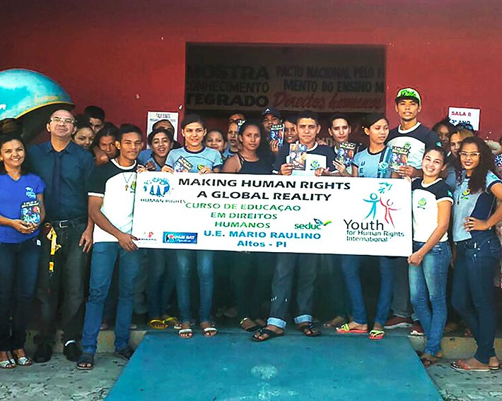Raimundo organiserade sedan en dag av samhällsverksamhet och besökte det fattiga Mimbó-samhället 24 mil från hans stad med ett team av frivilliga. Tillsammans delade de ut leksaker, kläder och mat i donationslådor med Ungdomar för mänskliga rättigheters (YHR) logo och visade YHR-informationsannonserna för dem som de hjälpte.